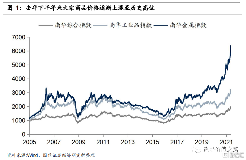 当前大宗商品价格上涨至历史高位,带动PPI大幅回升并创下了近三年半来的历史新高,市场对于通胀的上行或多或少存有担忧。随着去年下半年来全球经济复苏的持续推进,铜、铁矿石、煤等大宗商品价格大幅上涨,当前南华工业品和金属指数也已经创下历史新高,4月份国内PPI同比大幅回升至6.8%(前值涨4.4%),创2017年11月以来新高。