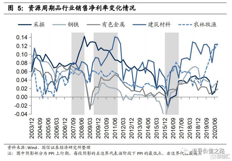结构上看,资源周期品是最受益于通胀上行的行业类别,量价齐升逻辑下,行业的盈利能力将显著提升。虽然整体来看,全部A股非金融企业的基本面受益于通胀上行,但不同行业对于通胀的敏感程度并不相同,也不是所有的行业都会受益于通胀上行。对于资源周期品行业来说,以PPI为主导的通胀一方面有利于企业销售净利率的改善,另一方面,需求也有望同步增长。量价齐升的推动下,资源周期品行业的盈利在通胀上行期往往都表现优异,是典型的抗通胀行业。从数据上来看,几乎在每一轮通胀上行前或阶段中,采掘、钢铁、有色金属、建材以及农林牧渔行业的ROE以及盈利增速都有显著改善。