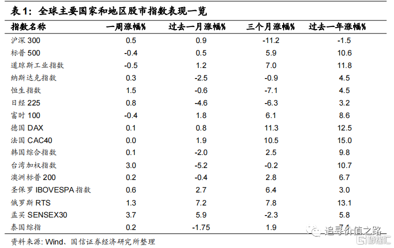 上周我们统计的全球各主要股票指数多数上涨。具体来看,发达市场中美股标普500指数和道琼斯指数双双下行,单周跌幅分别为0.4%和0.5%,纳斯达克指数单周上涨0.3%。欧洲市场中法国CAC40指数及德国DAX指数双双小幅上行,单周涨幅分别为0.02%和0.1%,富时100指数下跌0.4%,日经225指数单周上涨0.8%,韩国综合指数环比上涨0.1%,恒生指数单周上涨1.5%,澳洲标普200指数环比上涨0.2%。新兴市场中圣保罗IBOVESPA指数单周小幅上涨0.6%,泰国综指单周上涨0.2%,孟买SENSEX30指数单周上涨3.7%,俄罗斯RTS指数单周上涨1.3%,台湾加权指数单周上涨3.0%。