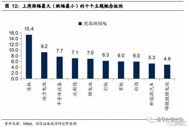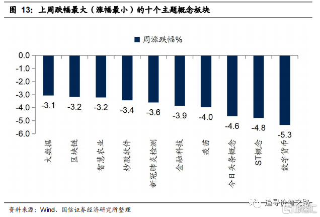 上周各主题概念指数多数下跌,175个概念指数中98个主题概念指数下跌。其中连板、动力电池和半导体设备三个概念板块表现居前,而数字货币、ST概念和今日头条概念等概念板块表现垫底。