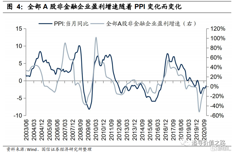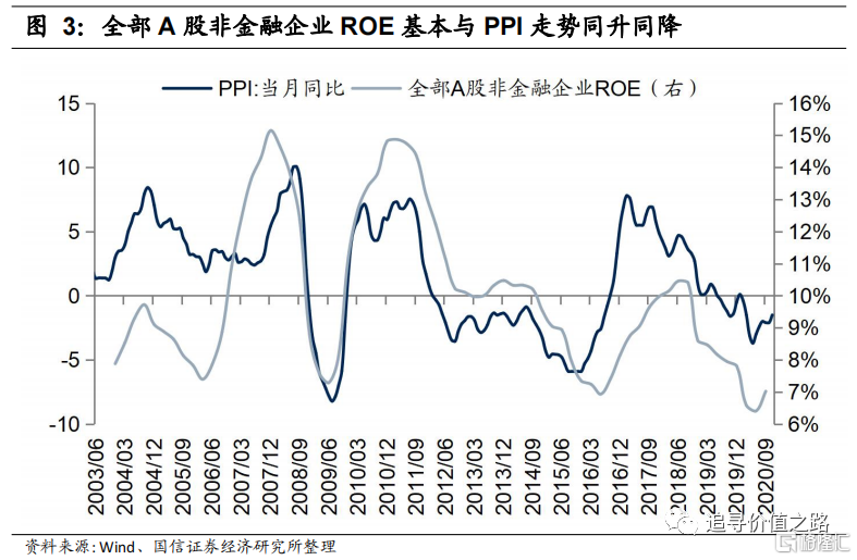 A股上市公司的历史经验显示,PPI同比增速和非金融企业的盈利能力的走势呈现显著的正相关性,大体上两者呈现同涨同跌的趋势,也就是说非金融企业整体是受益于通胀上行的。2006年以来,全部A股非金融企业ROE经历过三轮显著的上升周期,2006年3月至2007年12月、2009年6月至2011年3月、2016年6月至2018年9月,都出现在PPI上行周期。而在PPI下行周期,非金融企业的ROE也出现了明显的下降。