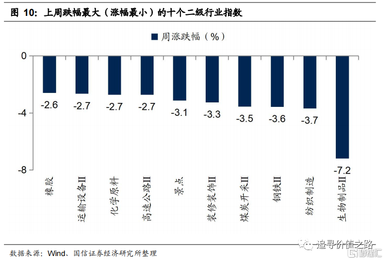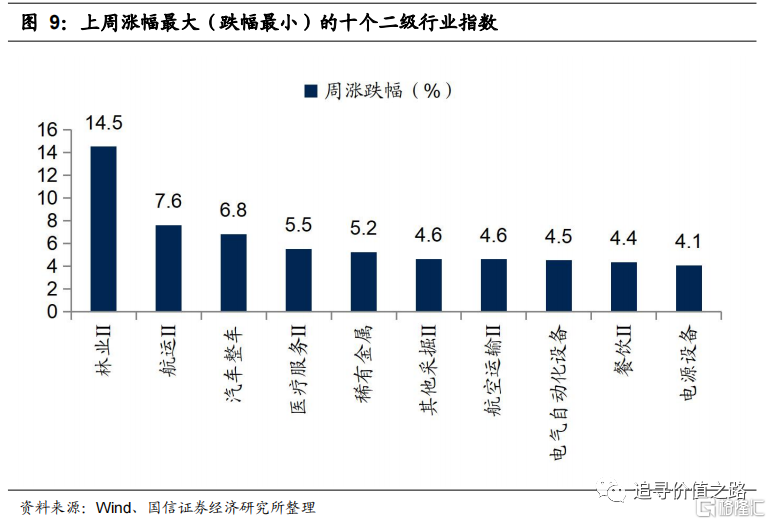 上周申万二级子行业共39个细分行业上涨。具体来看,林业Ⅱ行业单周大幅上涨14.5%,表现居前。航运Ⅱ和汽车整车行业涨幅次之,单周涨幅分别为7.6%和6.8%。而生物制品Ⅱ跌幅最大,单周大幅下跌7.2%。