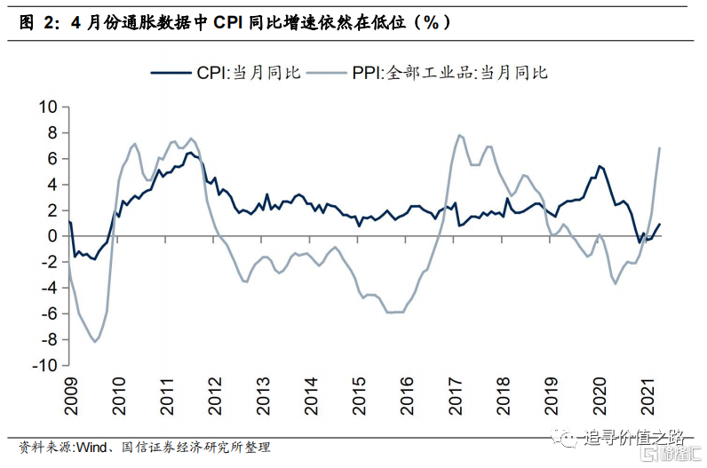我们认为通胀是远虑但非近忧,这当中尤其是国内CPI增速依然处于较为温和的水平,PPI向CPI的传导并不显著。4月份我国CPI同比增速为0.9%,核心CPI增速同样仅为0.7%,增速均不高。结构上看,食品项是主要拖累,4月份CPI食品项同比增速为-0.7%,依然处于低位,这当中权重较大的猪肉价格受产能恢复影响4月份同比大幅下降21.4%。
