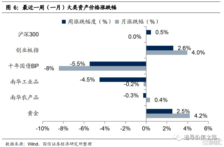 上周大类资产中股票、债券和黄金走强,商品走弱。具体来看,股票市场中,沪深300指数上周环比上涨0.5%,创业板指上周环比上涨2.6%。债券市场中,十年国债到期收益率下行5.5BP。商品市场中南华工业品指数环比下跌4.5%,南华农产品指数下跌0.3%。黄金价格环比上涨2.5%。上周上证综指环比下跌0.11%,国信价值指数单周下跌1.09%。