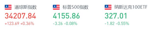 隔夜美股截至上周五收盘,道琼斯指数涨123.69点,涨幅0.36%,报34207.84点;标普500指数跌3.26点,跌幅0.08%,报4155.86点,标普指数录得连续第二周下滑;纳斯达克综合指数跌64.75点,跌幅0.48%,报13470.99点。上周道指下跌0.5%,标普500指数跌0.4%,纳指上涨0.3%。