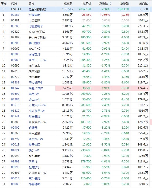 此外,京东健康跌近7%;网易-S跌超4%;微盟集团、新东方在线跌超3%;小米集团-W、京东集团-SW、美团-W跌超2%。