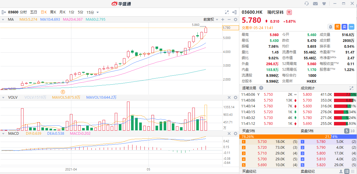 华盛资讯5月24日消息,港股牙科耗材制造商现代牙科再度大涨创历史新高,现升5.67%,报5.78港元每股,成交额2938万港元,最新总市值达55.46亿。值得注意的是,该股近3个月已累计暴涨超300%。