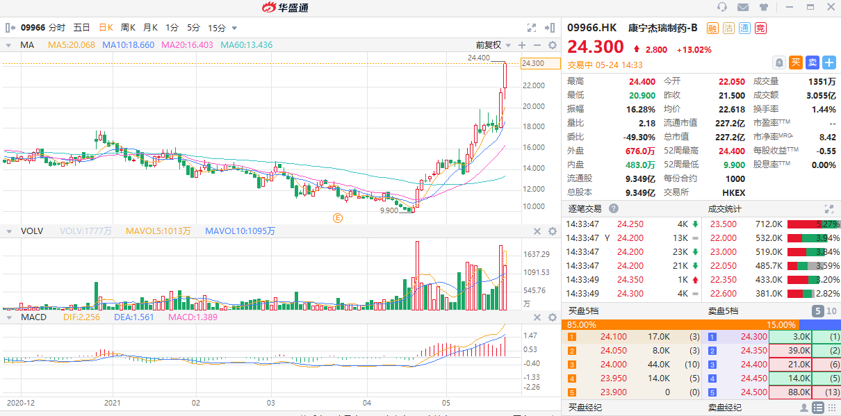 华盛资讯5月24日消息,康宁杰瑞制药-B午后大涨13%,突破历史高点;现报24.3港元每股,成交额达3.055亿港元,最新总市值227.2亿港元,股价自4月21日低位以来已涨近3倍。
