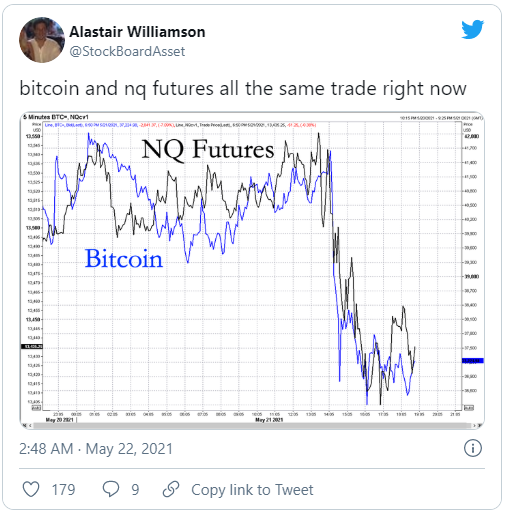 股票和加密货币本没有什么联系,但有投资者指出,最近科技股似乎对加密货币相关的消息反应灵敏。市场分析师指出了纳斯达克指数期货CFD(NQ)和比特币存在某种短期相关性,二者走势接近。