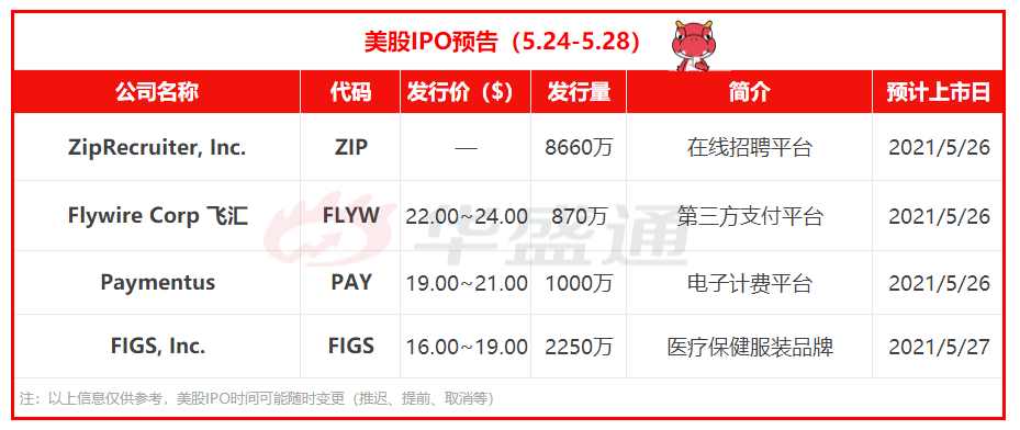 新股概况:ZipRecruiter预计将于本周三在纽交所直接上市,Goldman Sachs / J.P. Morgan / Barclays / Evercore ISI / William Blair / Raymond James担任财务顾问。