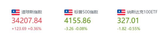 截至上周五收盘,道琼斯指数涨123.69点,涨幅0.36%,报34207.84点;标普500指数跌3.26点,跌幅0.08%,报4155.86点;纳斯达克综合指数跌64.75点,跌幅0.48%,报13470.99点。
