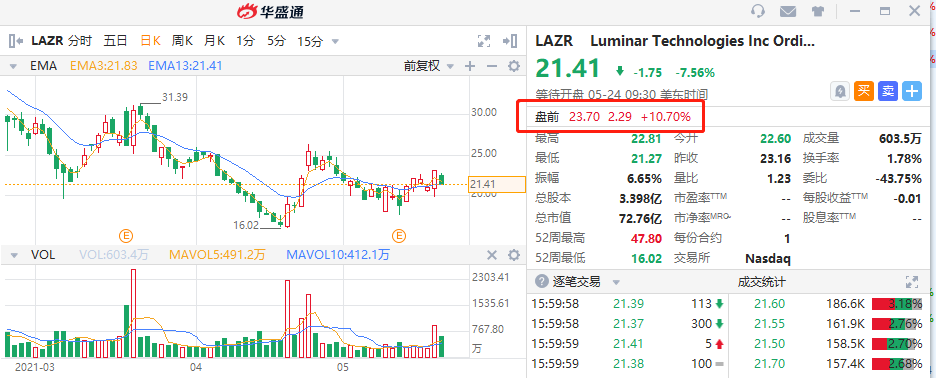 相关概念股方面,Luminar(LAZR)盘前直线拉升,截至发稿,现涨超10%。