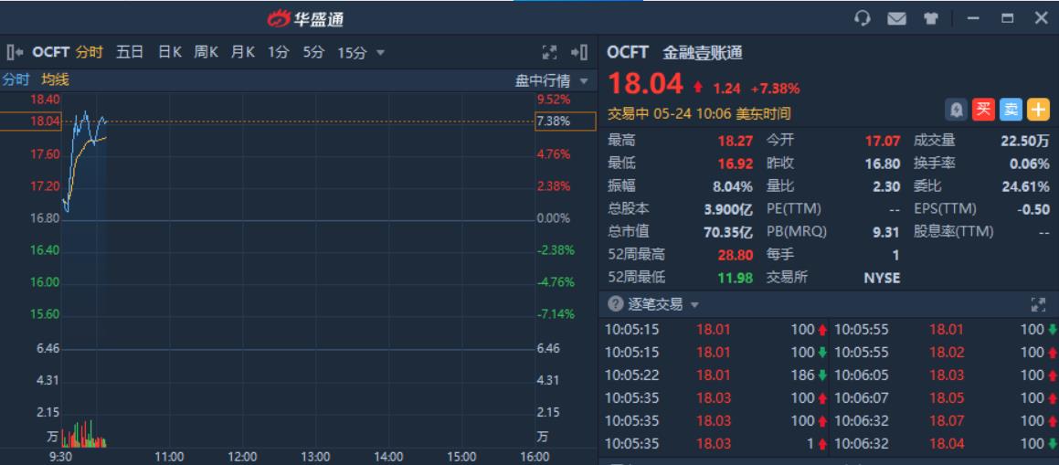 华盛资讯5月24日讯,美股早盘,部分知名中概股普涨,截至发稿,金融壹账通涨超7%,陆金所涨超4%,泛生子涨超2.6%,医美国际涨超5%。