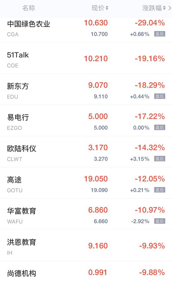 教育股中,51Talk跌超19%,新东方跌超18%,高途跌超12%,华富教育跌超10%,洪恩教育、尚德机构跌近10%。