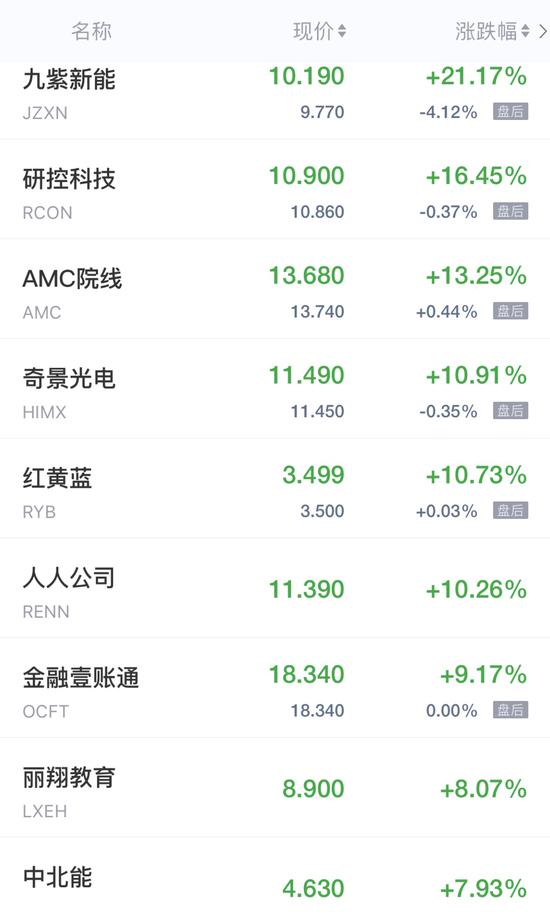 九紫新能涨超21%,红黄蓝、人人公司涨超10%,金融壹账通涨超9%,名创优品涨超5%,贝壳涨近4%,达达、唯品会、陆金所涨超3%,乐居涨超2%,房天下涨近2%,微美全息、途牛、金山云涨超1%,拼多多涨近1%。