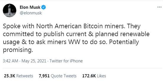 马斯克和北美的八大比特币挖矿机构会谈,这些机构决定成立一个挖矿委员会,让能源消耗的披露标准化。马斯克称这“可能有希望”。