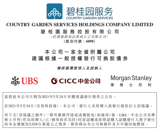 5月25日早间,碧桂园服务发布公告,于2021年5月24日,公司、发行人(公司的全资附属公司Best Path Global Limited)及经办人就发行债券订立协议,拟发行本金总额为50.38亿港元的债券。债券将由公司无条件及不可撤回地担保。