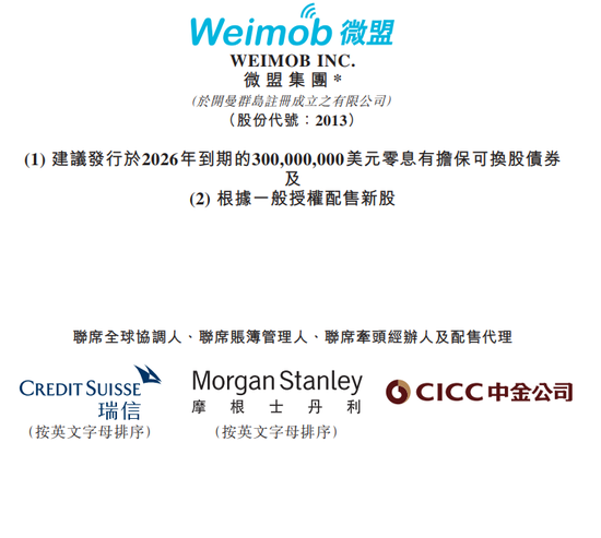 5月25日消息,微盟集团在港交所公告,本公司与经办人订立协议,将发行本金总额为300,000,000美元的2021可换股债券,初步换股价21港元;同时同意按配售价每股15港元认购156,000,000股新股。