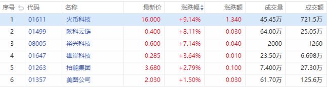 华盛资讯5月25日消息,比特币在周末暴跌后反弹,受消息提振,今日区块链板块普涨,截止发稿,火币科技涨9.14%;欧科云链涨8.11%;裕兴科技涨7.14%;雄岸科技涨3.64%;柏能集团涨2.79%;美图公司涨1.50%。