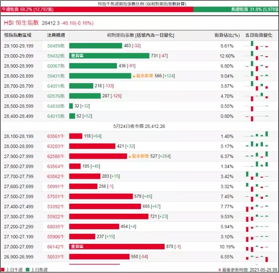 街货分布方面,至周一,恒指牛证街货重货区仍在收回价27000点至27500点之间,累计相当约2937张期指合约;恒指熊证街货重货区在收回价28800点至29200点之间,累计相当约2216张期指合约。