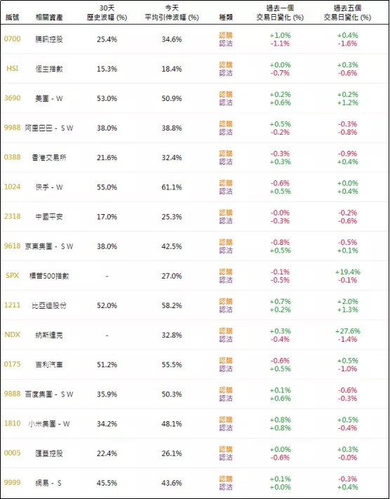 周一恒指相关权证的平均引伸波幅约18.4%,按日有所调升。个股方面,腾讯、美团、阿里、比迪、纳斯达克、百度、小米、网易等相关认购证的引申波幅按日有所调升;而港交所、快手、京东、标普500相关认购证的引申波幅则按日有所调降。