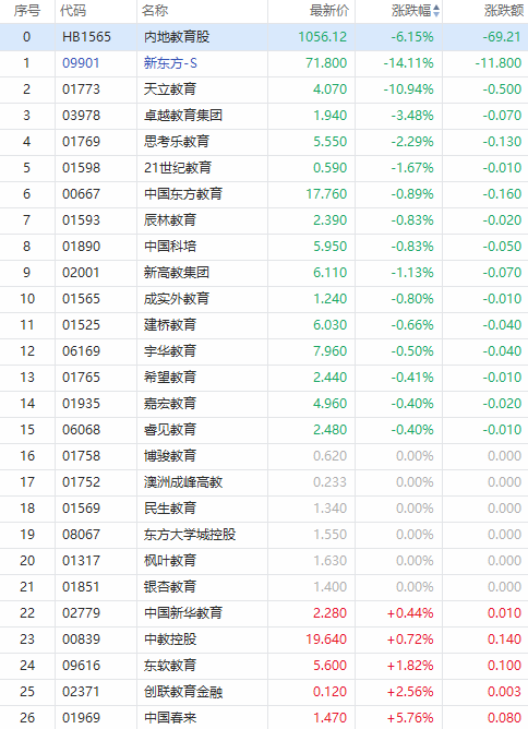 华盛资讯5月25日消息,受内地监管风波影响,今日港股教育股全线大跌,新东方-S跌超14%,股价较高位腰斩,天立教育跌超10%,卓越教育集团跌超3%,思考乐教育跌超2%,21世纪教育跌超1%。