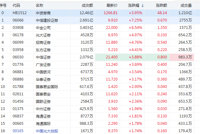 延续昨日强势,港A两地券商股今日再度集体走强。A股中信建投、哈投股份和湘财股份涨停,东方财富涨超7%,中金涨近7%。港股中信建投涨超7%,中金涨超6%,光大证券、招商证券、东方证券涨超4%。