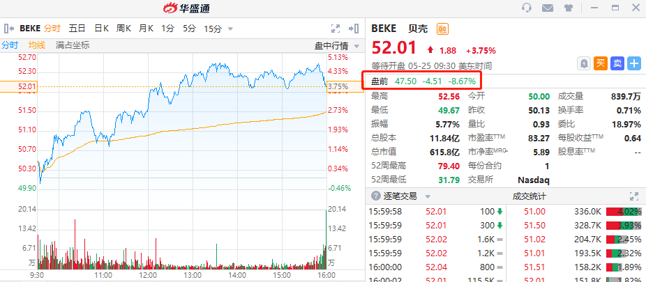 华盛资讯5月25日讯,美股盘前,截至发稿,贝壳(BEKE)跌近9%,传中国市监总局对贝壳找房启动反垄断调查。