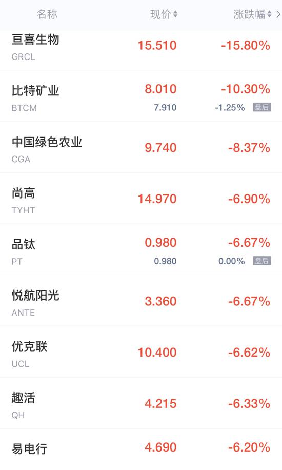 比特矿业跌超10%,中国绿色农业跌超8%,优克联、易电行跌超6%,名创优品跌5%,贝壳跌近3%,比特数字跌超2%,唯品会、人人公司、房天下、中网载线跌超1%。