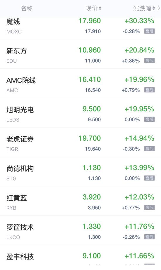 魔线涨超30%,箩筐技术涨近12%,知乎涨超8%,涂鸦智能、网易有道、途牛涨超7%,趣头条涨超5%,微博、新氧涨近5%,斗鱼涨超4%,金山云涨近4%,腾讯ADR、亿邦国际涨超3%,百度、爱奇艺、联代科技涨超2%,哔哩哔哩、京东、搜狐、陌陌涨超1%。