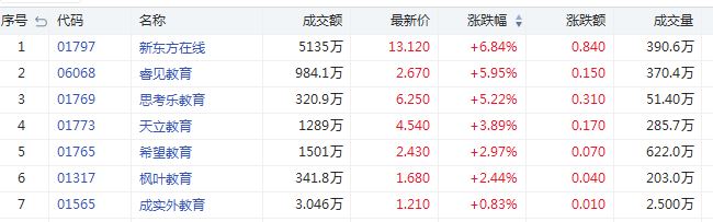 华盛资讯5月26日消息,今日港股教育股强势反弹,新东方在线涨近7%,睿见教育、思考乐教育涨超5%,天立教育涨超3%,枫叶教育、希望教育涨超2%。