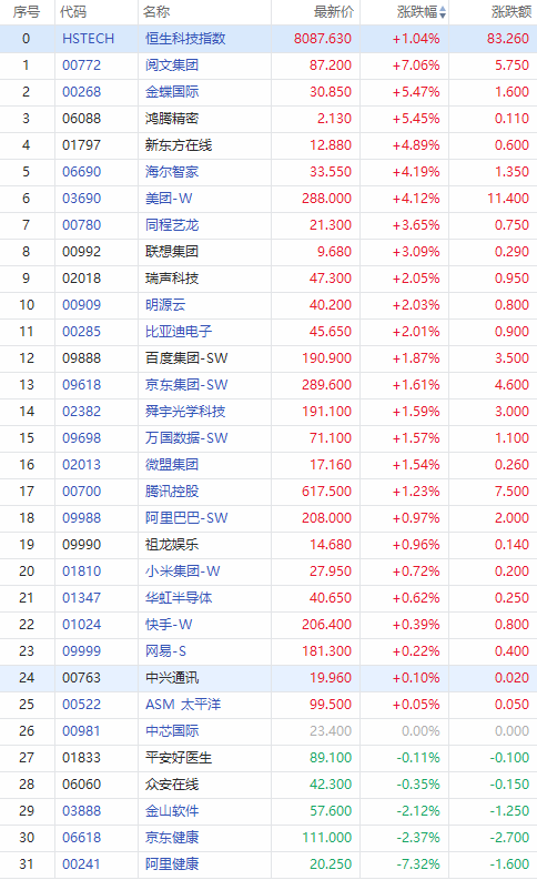 截至发稿,阅文集团涨超7%创三个月以来新高;金蝶国际、鸿腾精密涨超5%,新东方在线涨超4%,此前关于“教育机构暑期不许开课”传闻被澄清;海尔智家涨超4%,同程艺龙、联想涨超3%。