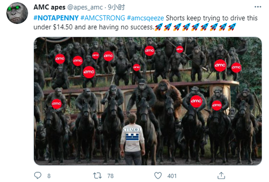 与此同时,推特上的用户相互劝说持有或购买更多的AMC股票,在#notapenny标签下,已经有超过17000个帖子。