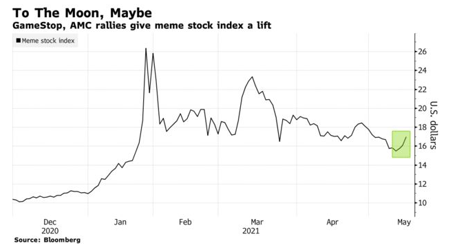 彭博追踪的一篮子37只meme股票上涨5.4%,自3月份以来首次突破50日均线。