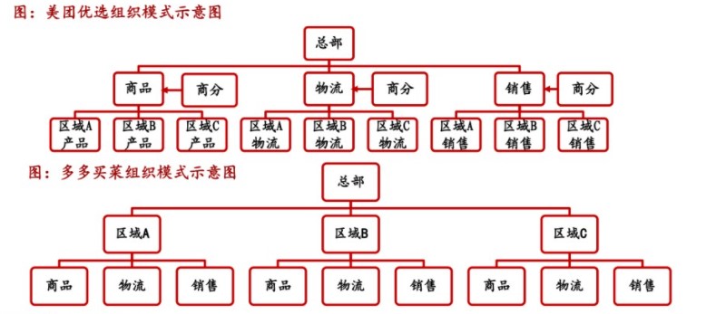 第二,从组织角度看,美团的强总部模式有利于发挥其规模与组织优势。美团优选的事业部成立于2020年7月,商品、物流、销售三架马车汇于总部;而多多买菜业务则是区域权力更大,因而灵活性更强,不过,也因此会出现区域间经营能力差异高度以来大区业务领导能力的情况。