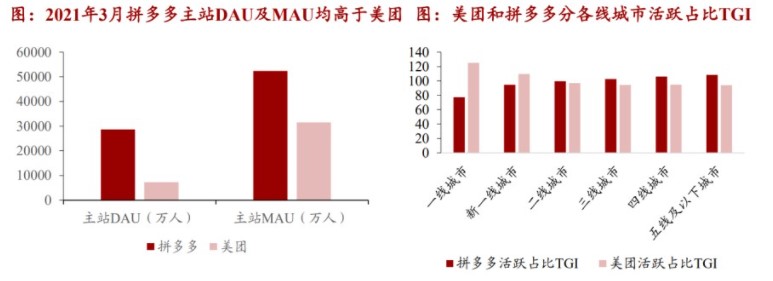据Questmobile数据,2021年3月拼多多主站DAU(Daily Active User)为2.87亿,MAU(Monthly Active User)5.24亿,而美团仅达0.73亿和3.15亿,拼多多在三至五线的城市的活跃TGI均高于100,远超美团优选。
