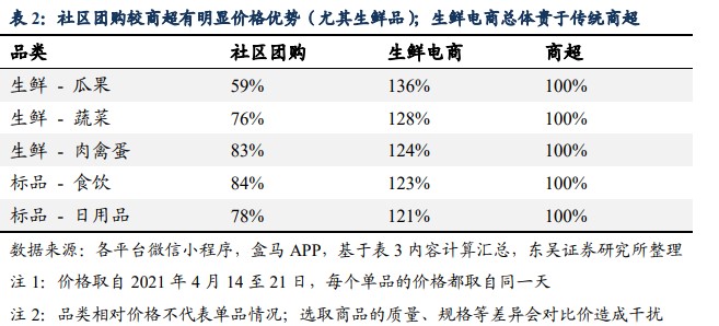 不过,尽管市场监管已对这种恶性竞争出手,社区团购的价格整体上仍然便宜于普通的生鲜电商和本地商超。据东吴证券研报显示,以线下连锁商超价格为基准,社区团购要在整体上便宜20%-25%。