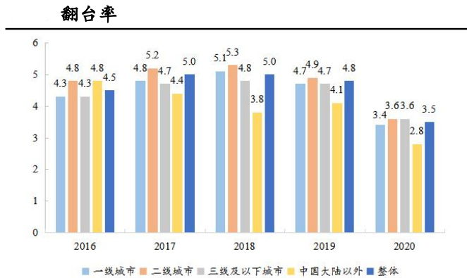 其中,一线城市为3.7,同比下降24.79%;二线城市4.1,同比下降19.61%,三线及以下城市为4.3,同比下降12.24%。