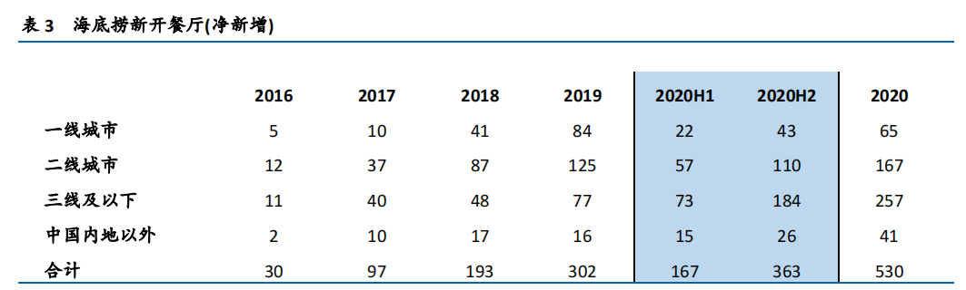 2020年海底捞新开店数量为544间(关闭餐厅14间,全年净新开530间),其中上半年新开173间,下半年新开371间,比2019年全年新开店302间,开店速度明显加快。