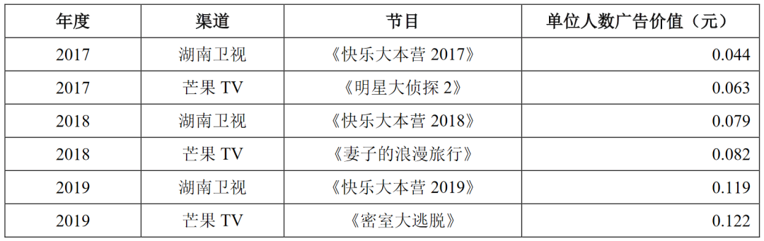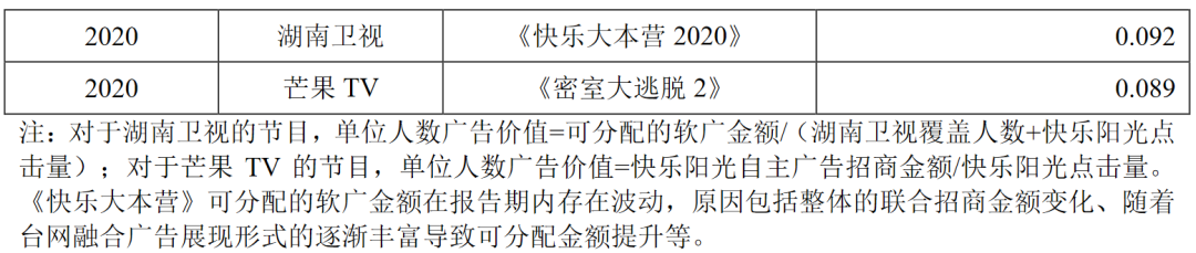 以2020年为例,芒果TV更具代表性的综艺显然是《乘风破浪的姐姐》。作为一档年度爆款,《姐姐》的广告客户总数超40家,招商数据也刷新多项纪录。基于更多的广告客户覆盖,其单位人数广告价值大概率要远高于同期的《快乐大本营》。