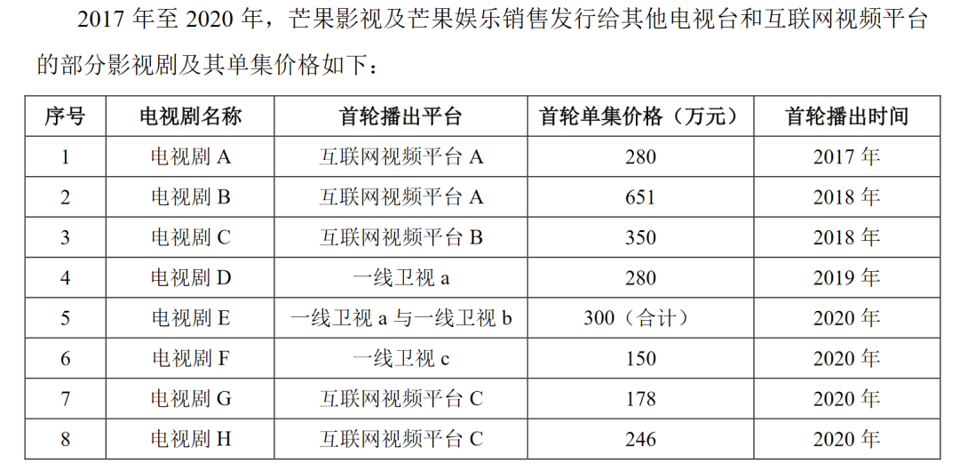 相比之下,如果芒果TV将自制内容出售给湖南卫视,则依据市场标准。根据芒果超媒的回复函,2017年至2020年,芒果影视及芒果娱乐销售发行给湖南卫视的影视剧首轮单集价格主要位于200-400万元的区间内。