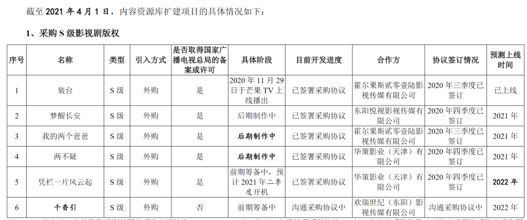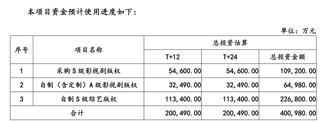 如今,芒果超媒募资的45亿中,有40亿的用途便在于此,即采购或自制17部影视剧版权和制作18部综艺节目版权。