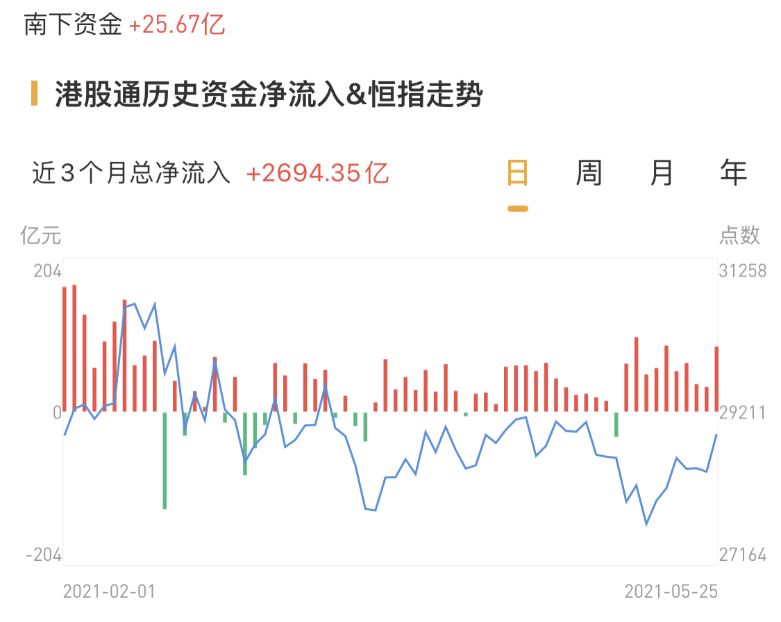 南下资金今日净流入港股高达25.67亿港元。