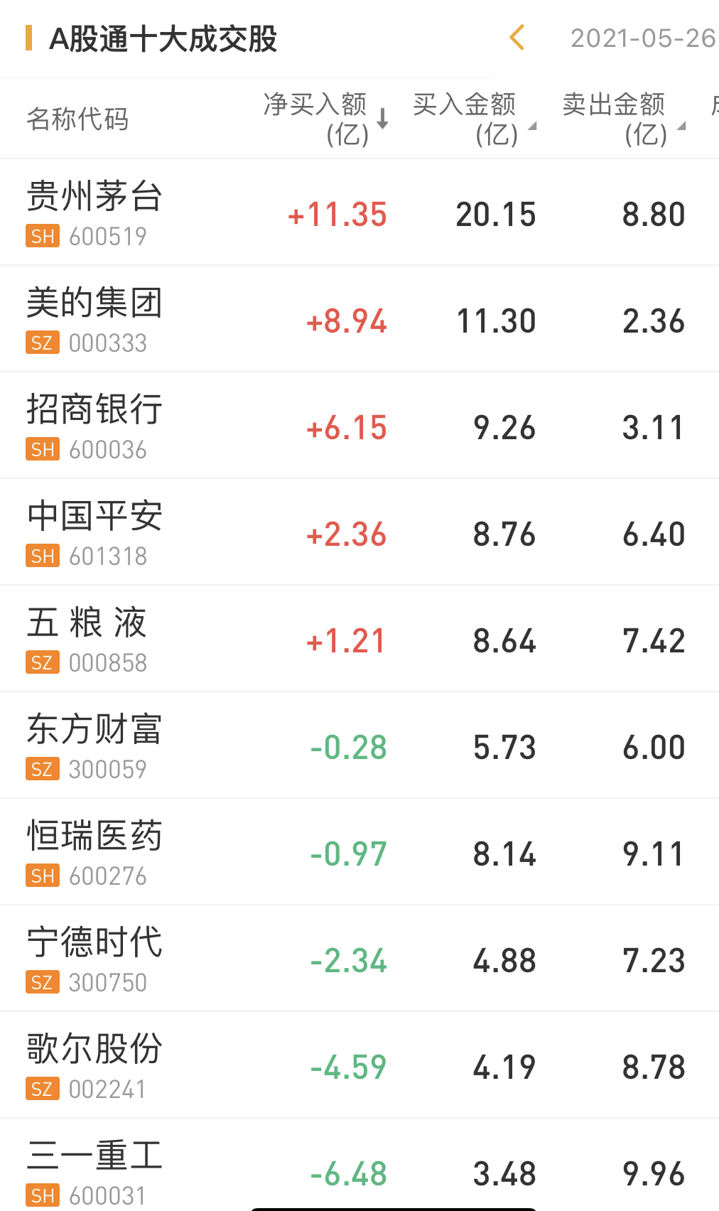 北上资金今日净买入贵州茅台11.35亿元,为今日买入之最。此外,北上资金净买入美的集团8.94亿元,净买入招商银行6.15亿元。