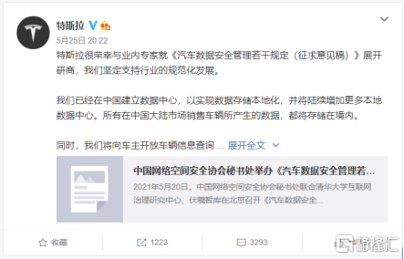 在这条官方微博下,特斯拉还附上了中国网络空间安全协会发布的关于举办《汽车数据安全管理若干规定(征求意见稿)》专家研讨会的链接。可以看出,特斯拉此番在中国建立数据中心,主要是出于政策因素的考量,还有对于此前由车主维权事件引发数据安全争议的回应。