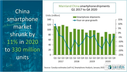 Canalys数据显示,2020年国内智能手机市场下降了11%,出货量自2017年来也逐年下降。反观新能源汽车市场,随着特斯拉多年来对中国消费者的市场教育以及“碳中和”政策加持,消费者对新能源汽车的接受度越来越高。