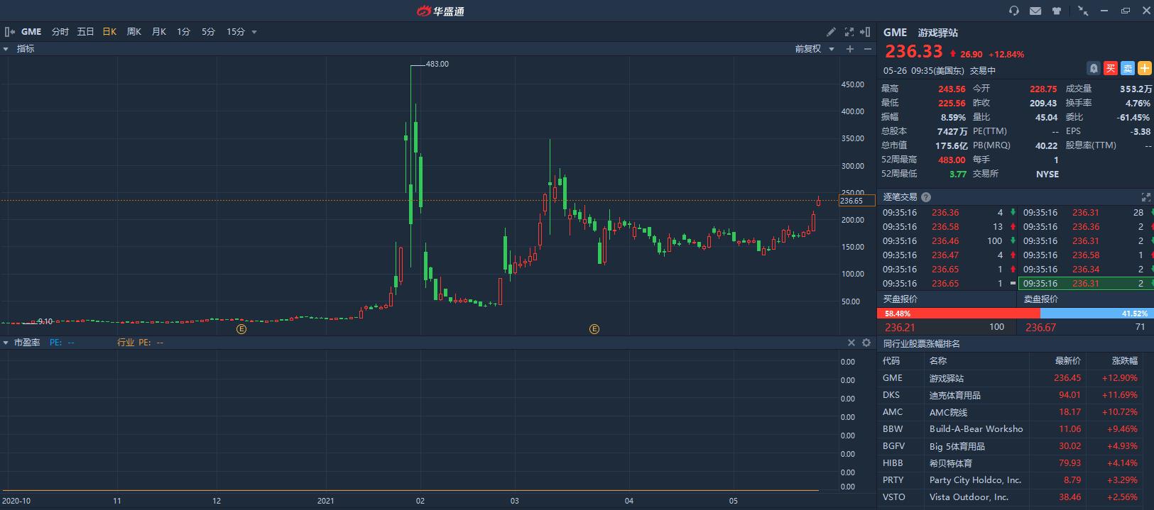 华盛资讯5月26日消息,WSB概念股今日普涨,截至发稿,游戏驿站涨近13%;AMC涨超9%;黑莓涨超5%。高斯电子涨近6%。