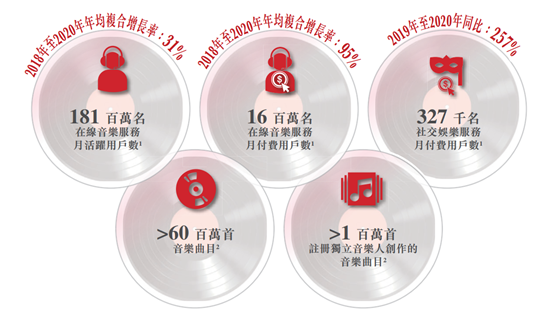 2020底公司在线音乐服务的月付费用户数为1600万名,2018年至2020年年均复合增长率为95%。