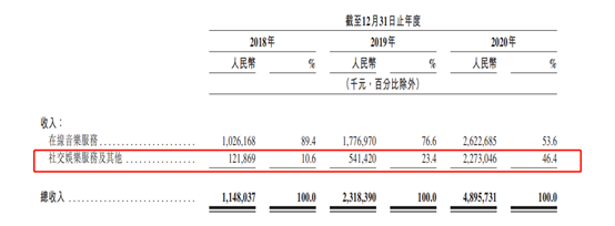 据招股书,网易云社交娱乐收入由2019年的人民币5亿元至2020年的人民币23亿元,增长率超450%;社交娱乐收入占总收入比重由2018的10%增长到2020的46.4%!网易云音乐的收入不再依赖音乐。