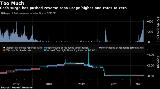 从回购协议到国库券,其它货币市场工具的收益率因流动性过剩而大幅下降甚至变成负收益率。这反过来推动了对美联储逆回购协议的需求,使用量在周二增至4330亿美元的纪录第三高水平。